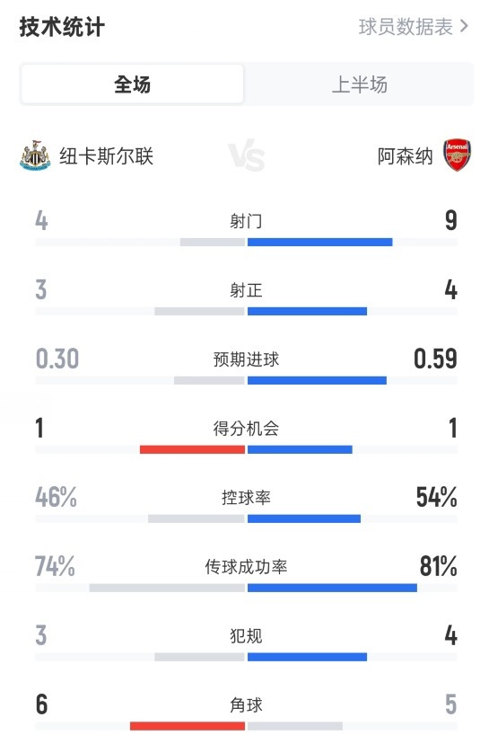 9月29日讯 2025-26赛季英超联赛第6轮,纽卡斯尔主场迎战阿森纳,半场纽卡暂 1-0阿森纳。