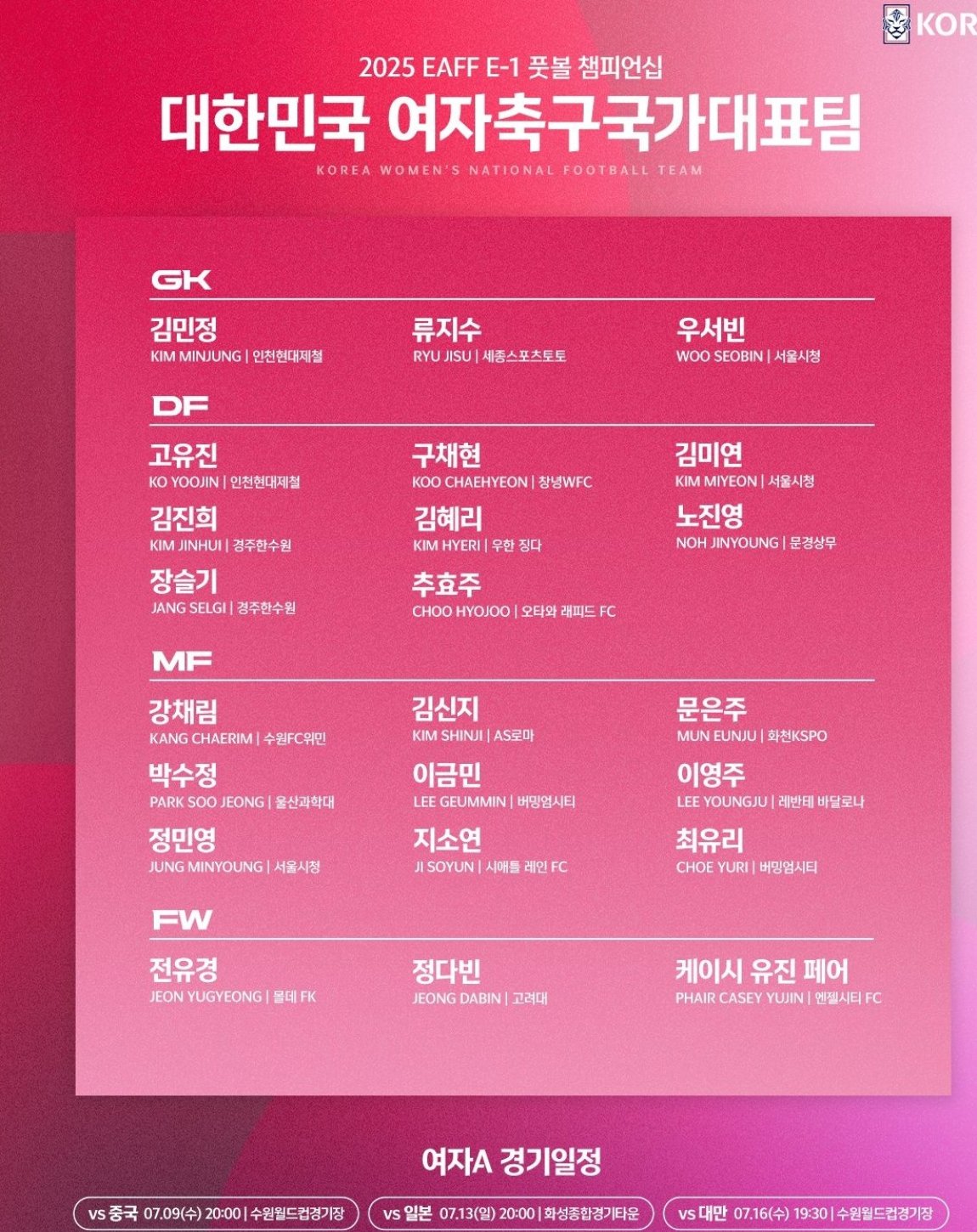 首战中国队!韩国女足东亚杯名单:9位旅外球员+12位本土联赛球员