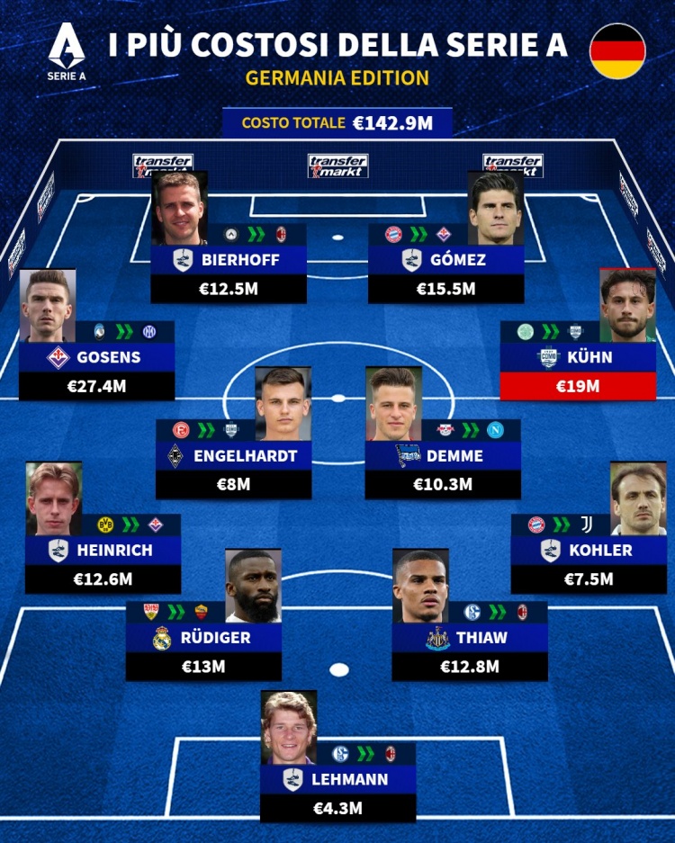 9月24日讯 德国转会市场统计了德国球员转会意甲球队的价格,并列出德国球员转会意甲球队价格最高阵容,比埃尔霍夫、戈森斯、莱曼、吕迪格、库恩在列。