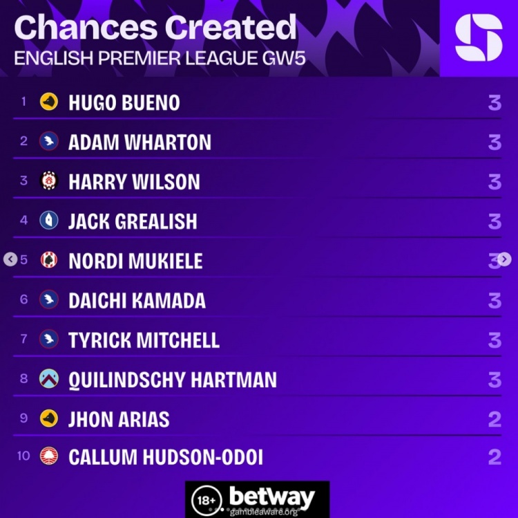 9月24日讯 英超第5轮战罢,squawkafootball列各项数据排行,在创造机会方面,狼队后卫乌戈-布埃诺等8名球员各创造3次机会。
